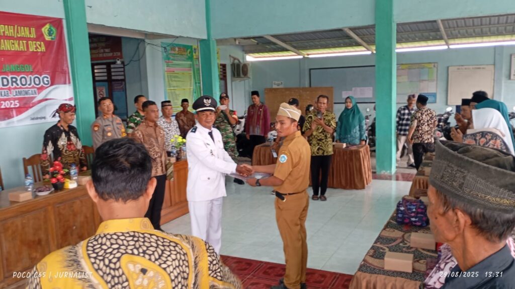 LAMONGAN – Desa Jatidrojog, Kecamatan Kedungpring, Kabupaten Lamongan, menggelar acara Pengambilan Sumpah Janji dan Pelantikan Perangkat Desa pada hari Jumat, 29 Agustus 2025. Acara yang berlangsung di Balaidesa Jatidrojog ini menandai resminya Yoga Mandala Putra sebagai Kepala Dusun Janggol. Pelantikan ini diharapkan menjadi momentum penting dalam penguatan tata kelola dan pelayanan masyarakat di tingkat dusun.