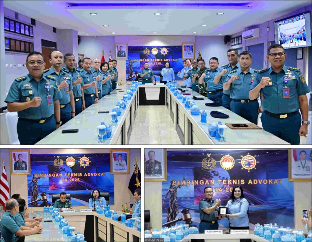 Jakarta, 28 Agustus 2025 – Markas Besar TNI Angkatan Laut (Mabesal) melalui Diskumal (Dinas Hukum TNI AL) resmi membuka kegiatan Bimbingan Teknis (Bimtek) Advokat Tahun Anggaran 2025, Kamis (28/8), di Markas Dinas Hukum Mabes TNI AL, Cilangkap, Jakarta Timur. Pembukaan dilaksanakan oleh Kepala Dinas Hukum TNI AL, Laksamana Pertama TNI Dr. Ali Ridlo, S.H., M.M., M.Tr.Hanla., M.H., bersama Ketua Umum Advokat Bangsa Indonesia (ABI), Sri Sudarti, S.H., S.E., M.H., M.M. yang juga Sekretaris Depkumham PJI (Departemen Hukum dan HAM PJI)