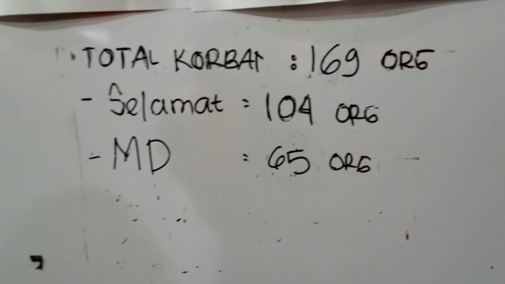 Hingga hari ini senin (6/10/2025), yang telah sampai pada evakuasi hari ke 8 pukul 20.00 Wib, total korban yang berhasil dievakuasi mencapai sekitar 169 orang. Dari jumlah itu, LR sebanyak 75 orang, LB sebanyak 28 orang, Tanpa Perawatan/luka sebanyak 1 orang, dan MD sebanyak 65 orang.