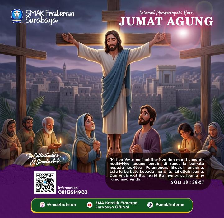 Surabaya – Dalam rangka memperingati Hari Jumat Agung, keluarga besar SMAK Frateran Surabaya menyampaikan ucapan selamat sekaligus mengajak seluruh umat Kristiani untuk merenungkan makna mendalam dari peristiwa wafatnya Yesus Kristus di kayu salib.(3/04/2026)