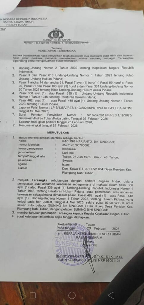 TUBAN.Liramediarevolusi.com Kapolres Tuban digugat prapradilan ke Pengadilan Negeri Tuban, ini berawal dari penetapan tersangka seorang perangkat Desa Penidon, Kecamatan Plumpang, Kabupaten Tuban, bernama Kacung Harianto, ini tertuang dengan surat penetapan nomor : S.Tap / 66 / II /Red.1.19/2026/ Satreskrim.